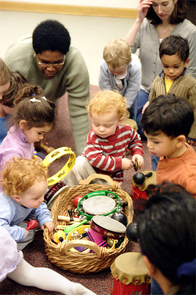 Fully trained, registered Music Together teachers lead groups of six to twelve children and their parents or caregivers (nannies, babysitters, grandparents, or relatives) in forty-five minutes of music and movement experiences.